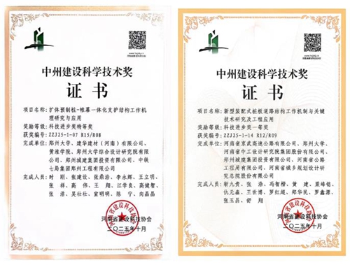 鄭州城建集團(tuán)的“擴(kuò)體預(yù)制樁—帷幕一體化支護(hù)結(jié)構(gòu)工作機(jī)理研究與應(yīng)用”與“新型裝配式樁板道路結(jié)構(gòu)工作機(jī)制與關(guān)鍵技術(shù)研究及工程應(yīng)用”兩項(xiàng)科研項(xiàng)目,分獲河南省“中州建設(shè)科學(xué)技術(shù)獎”特等獎和一等獎。